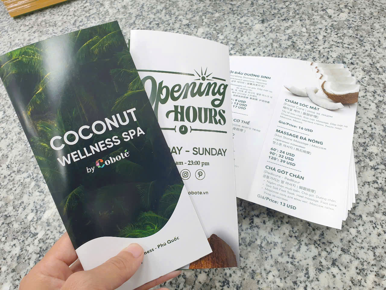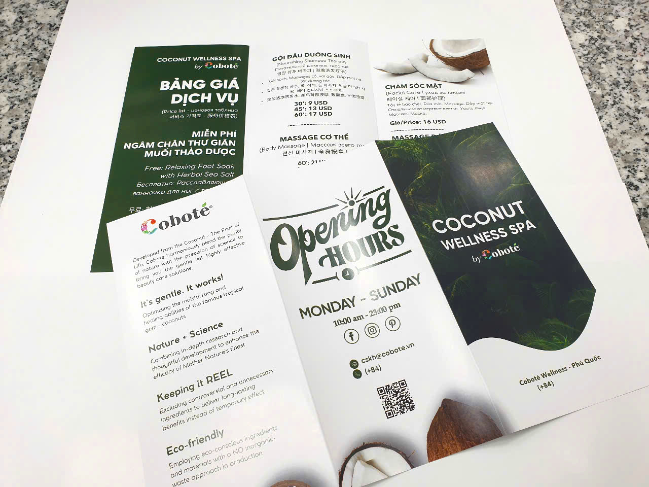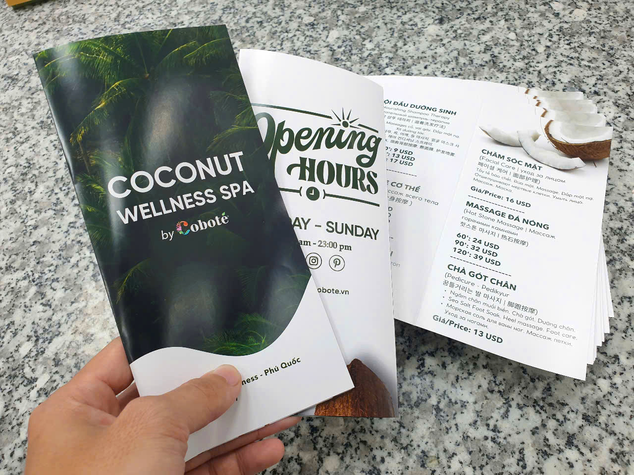 - Trang bìa 1: vị trí này là quan trong nhất, thường để gây chú ý về mặt thị giác (màu sắc, hình ảnh, nội dung,…) nó sẽ quyết định khách hàng có lật trang kế để xem tiếp brochure của mình hay không. Do đó, số lượng thông tin dạng text thường rất ngắn gọn mà chỉ nổi bật về hình ảnh, khuyến mãi, tên sản phẩm.